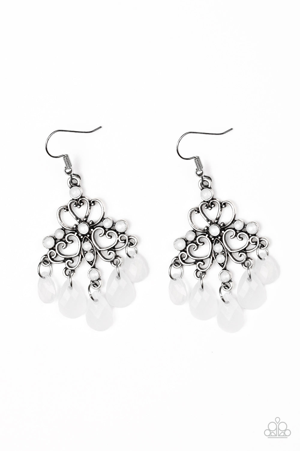 Cloudy white teardrops swing from the bottom of an ornate silver frame radiating with milky white rhinestones for a whimsical look. Earring attaches to a standard fishhook fitting.