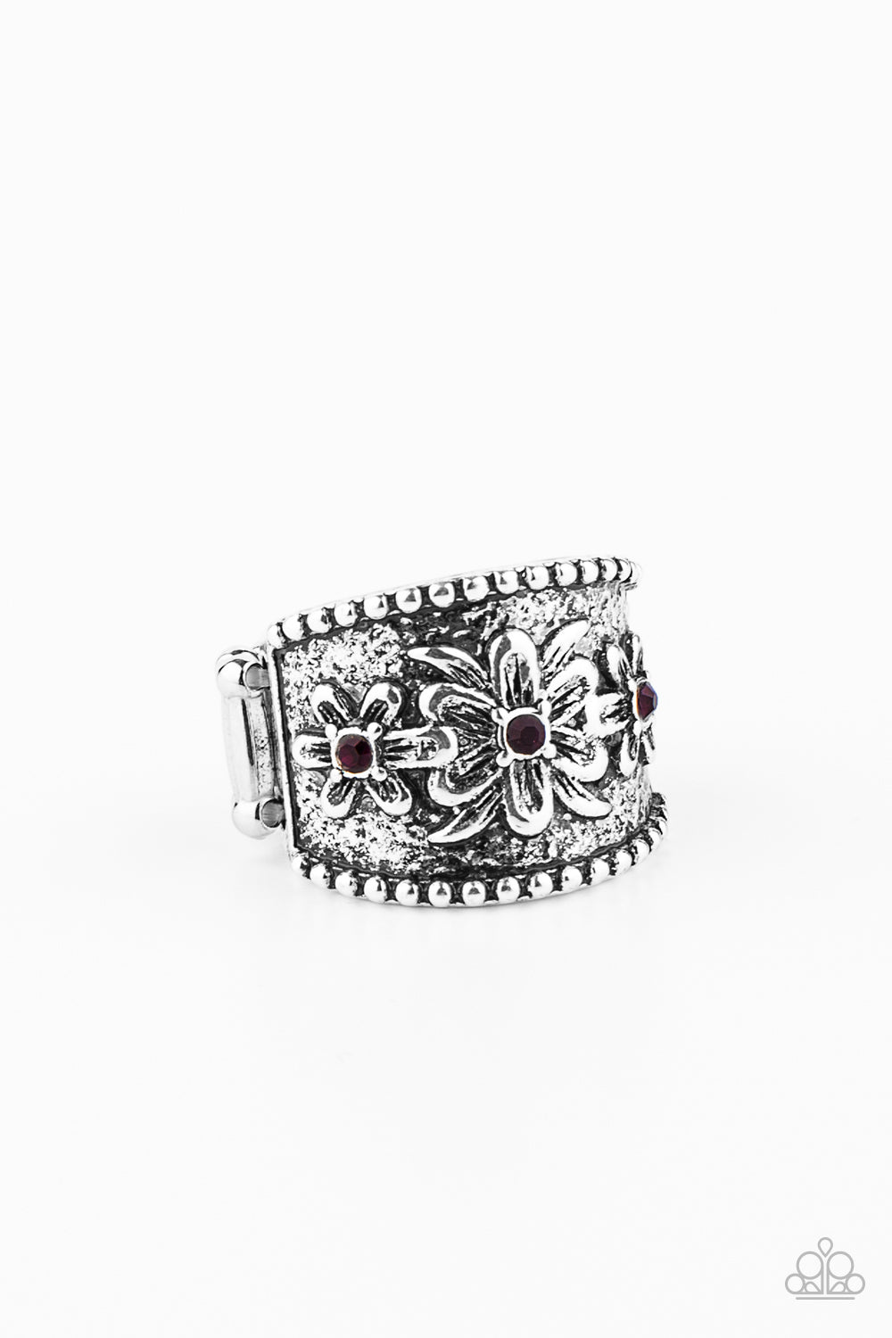 Dotted with dainty Magenta Purple rhinestone centers, tropical inspired flowers are embossed across the front of an antiqued studded silver band for a whimsical display. Features a stretchy band for a flexible fit.