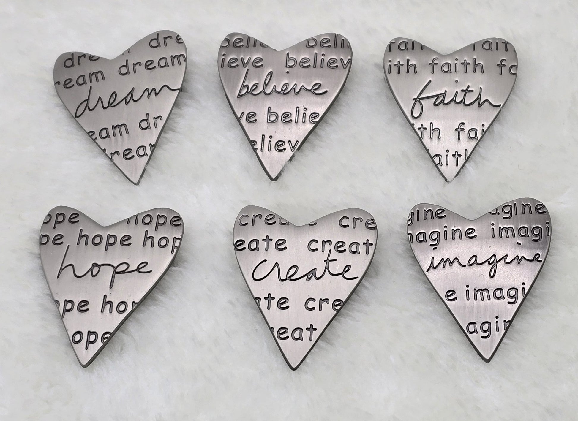 These Vintage Inspirational Heart Brooch Pins add a perfect touch to feature on your gym bag or backpack, or even add daily inspiration to your jacket or blazer. Each brooch pin features the words: "Dream", "Believe", "Faith", "Hope", "Create", and "Imagine" - repeated in various fonts and a central script.